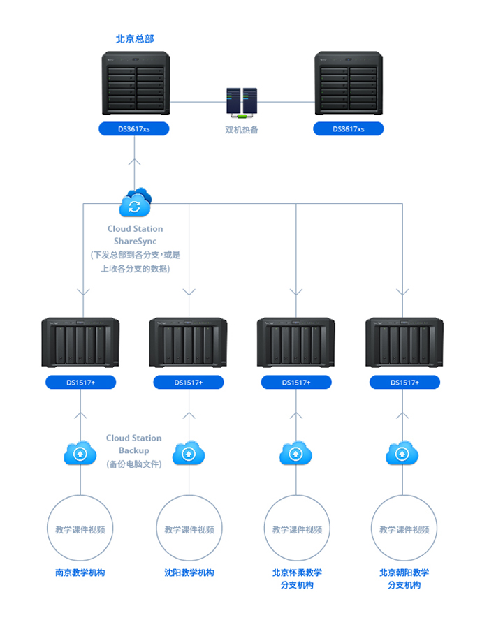 其次,采購了300臺DS1517+(8GB)在全國各地的教育培訓(xùn)機構(gòu)辦公地點設(shè)立,并與總部的DS3617xs實現(xiàn)異地數(shù)據(jù)互通,打破信息孤島,實現(xiàn)數(shù)據(jù)互通,提高效率。