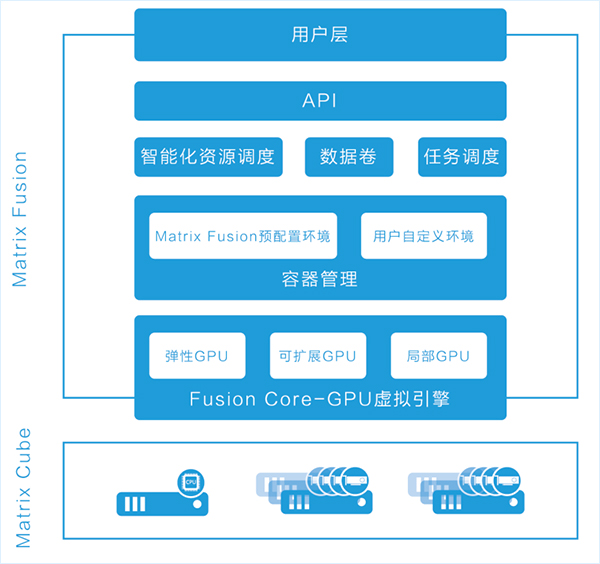 Matrix Fusion 支持各類硬件及操作系統(tǒng),提供端到端的基礎(chǔ)設(shè)施軟件解決方案,管理基礎(chǔ)CPU和GPU計算資源,能夠自動進(jìn)行工作負(fù)載資源調(diào)配。深度學(xué)習(xí)是同時利用CPU和GPU處理工作負(fù)載的典型應(yīng)用,Matrix Fusion通過整合用戶所有的硬件資源(集群亦或是單機(jī))成為CPU+GPU資源池,再將資源根據(jù)開發(fā)者需要重新分配CPU和GPU到開發(fā)者的虛擬環(huán)境下,管理員也可以將多余的計算資源靈活分配給其他用戶或更為嚴(yán)苛的工作負(fù)載。