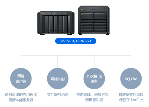 根據(jù)網(wǎng)格化管理的業(yè)務(wù)需求,群暉制定了基于 NAS 文件服務(wù) + Node.js 數(shù)據(jù)庫(kù)服務(wù)( sqlite+socket )+ 綠色客戶(hù)端軟件的方案,從一開(kāi)始僅啟用了基礎(chǔ)的文件共享功能,再到資源整合與程序開(kāi)發(fā),整體架構(gòu)實(shí)現(xiàn)快速部署,能夠滿(mǎn)足鹿城區(qū)行政執(zhí)法業(yè)務(wù)需求。