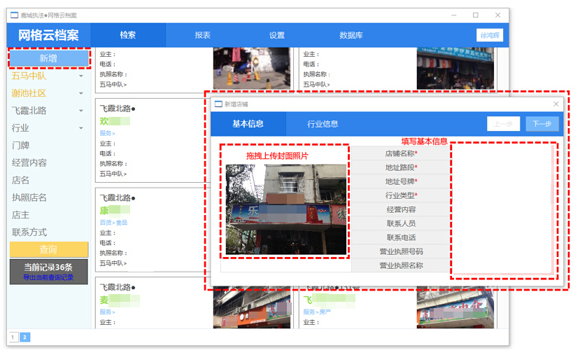 2、上傳信息:執(zhí)法人員通過(guò)系統(tǒng)可新增事件,可添加圖片以及填寫(xiě)基本信息,例如店鋪名、地段、地址。?
