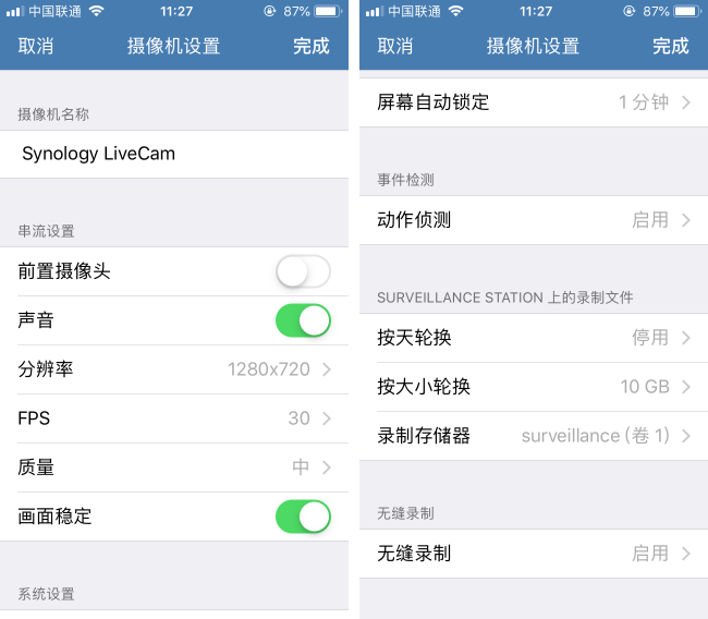 當(dāng)然你可以對監(jiān)控用的手機(jī)進(jìn)行一番設(shè)置,通過進(jìn)階設(shè)置你可以對錄像質(zhì)量進(jìn)行進(jìn)一步的設(shè)置(分辨率、幀數(shù)、質(zhì)量以及使用的攝像頭等),同時你還可以設(shè)置報(bào)警規(guī)則(動作監(jiān)控報(bào)警)并且自定義錄像在 NAS 上的保留天數(shù)以及是否無縫錄制——即便是遇到斷網(wǎng),也可以先將錄制視頻保存在手機(jī)上,然后在有網(wǎng)絡(luò)的情況下上傳到 NAS 上。