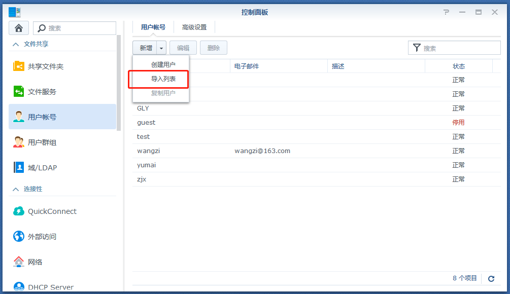 在用戶賬號列表中選擇新增右邊的倒三角展開下拉選項(xiàng),選擇導(dǎo)入列表。