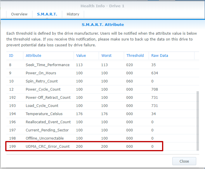 3、檢查硬盤的屬性 ID 199。如果原始數(shù)據(jù)增加,或者如果系統(tǒng)無法識別硬盤,則很可能發(fā)生故障。如果更換硬盤的原始數(shù)據(jù)增加,而可疑故障硬盤的原始數(shù)據(jù)保持為零,則問題與 Synology NAS 有關(guān)。如果在插入上一個插槽時無法識別更換硬盤,則插槽可能發(fā)生故障。